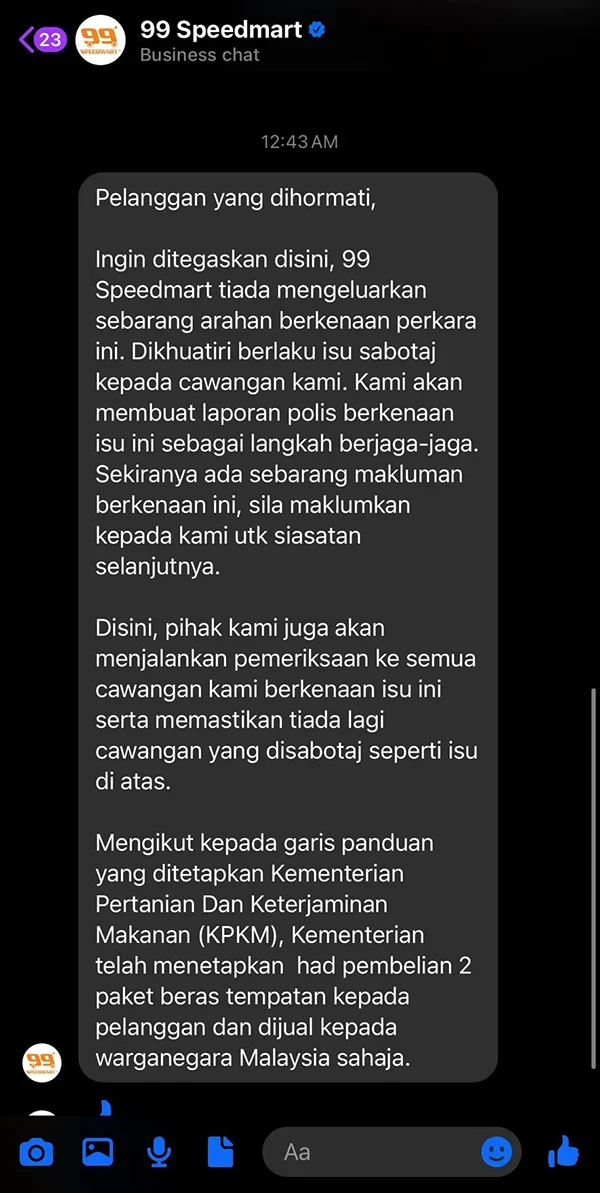 99 Speedmart 很快在官方声明中回应此事,强调公司从未发布过任何关于白米购买限制的指示,怀疑此告示是某些别有用心的人故意张贴的恶意破坏行为。公司表示,已向警方报案,以确保所有分行不会再发生类似的情况。同时,公司也敦促顾客,如发现任何异常情况,可立即向 99 Speedmart 反馈,以便进行调查。