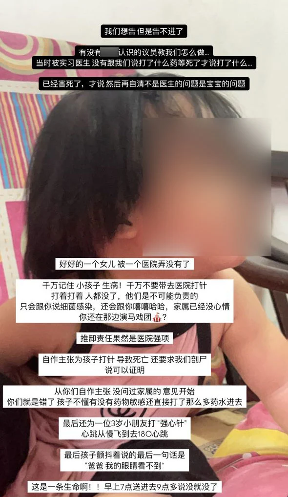 注射完成后,女童突然表示“爸爸,我的眼睛看不到了”,这句话成为她生命中的最后遗言。短短两小时后,孩子生命终止,家属无法接受,母亲悲痛怒斥:“实习医生不要出来害人!” 她质疑医院是否存在严重的医疗过失,并要求医院给予合理交代。