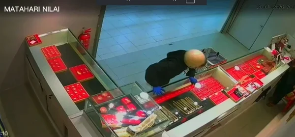 “汝来金店抢劫案” 近日震动芙蓉商圈,两名蒙面男子在闭路电视下被完整记录作案过程。据警方透露,事件发生在汝来新城阳光商场的金店内,两人仅用约一分钟,就将多盘价值约6万令吉的金饰装入送货袋后迅速离开。视频中,一名戴白色头盔的男子率先进入店内,跨过柜台将金饰取出,而随后的同伙戴蓝色头盔持疑似手枪的枪械进行协助把风。